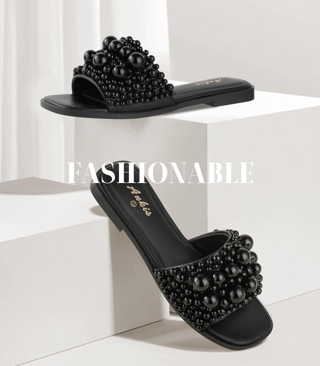 Ankis Black White Sandals Women Flat Sandals Comfortable Womens Slide Sandals Fashion Flat Sandals for Women 2025 Summer(Black)