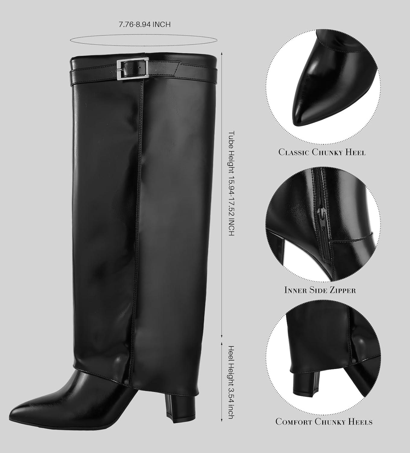 Ankis Fold Over Knee High Boots for Women Chunky Heels Pointed toe with Side Zipper Long Tall Boots(Black Pu)