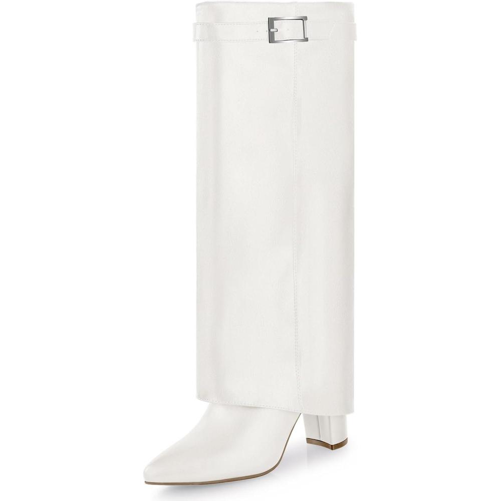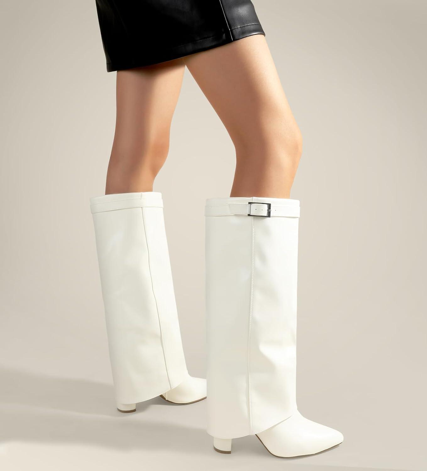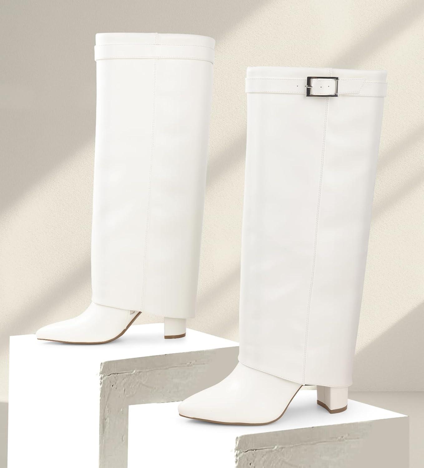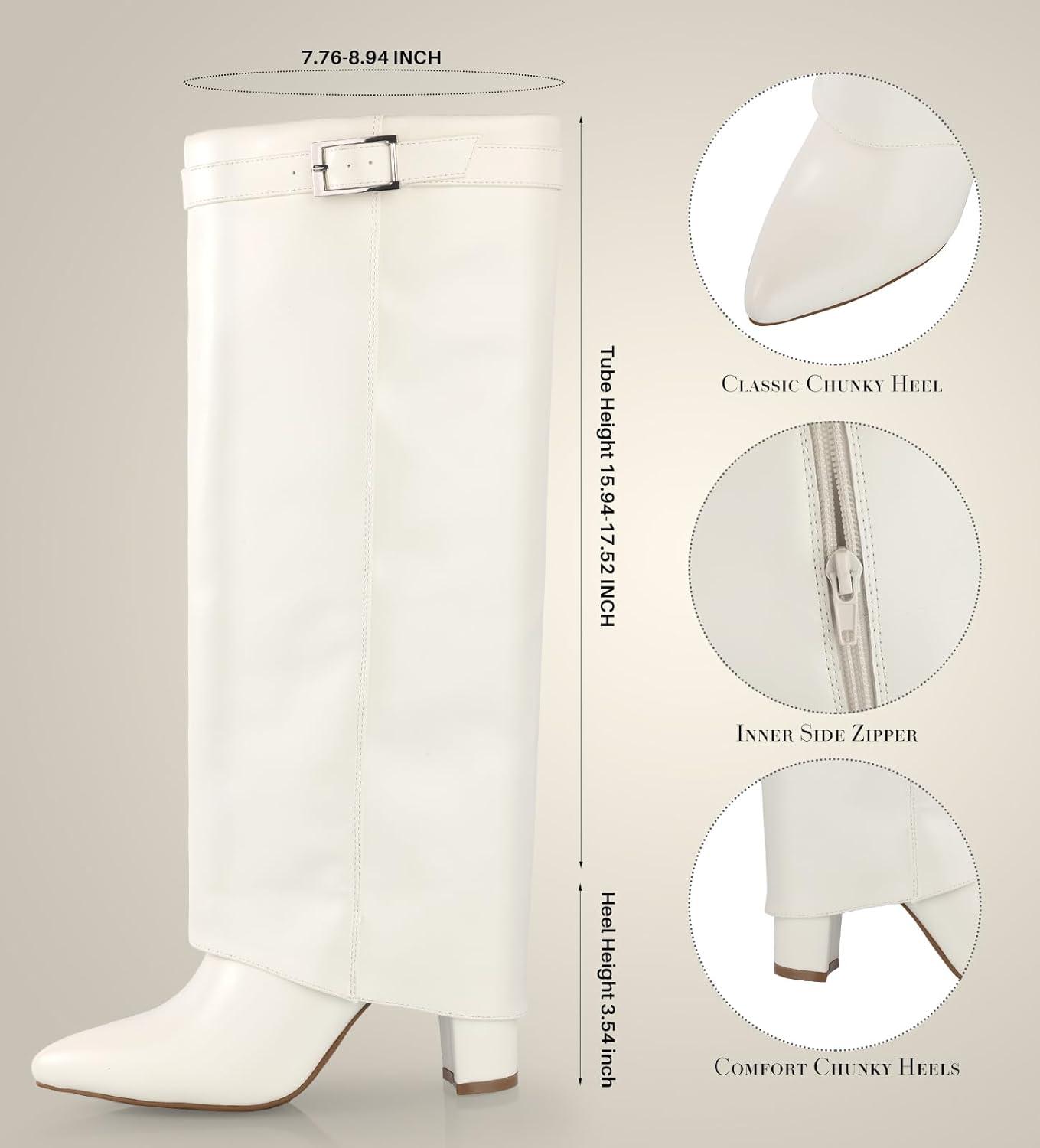 Ankis Fold Over Knee High Boots for Women Chunky Heels Pointed toe with Side Zipper Long Tall Boots(White Pu)