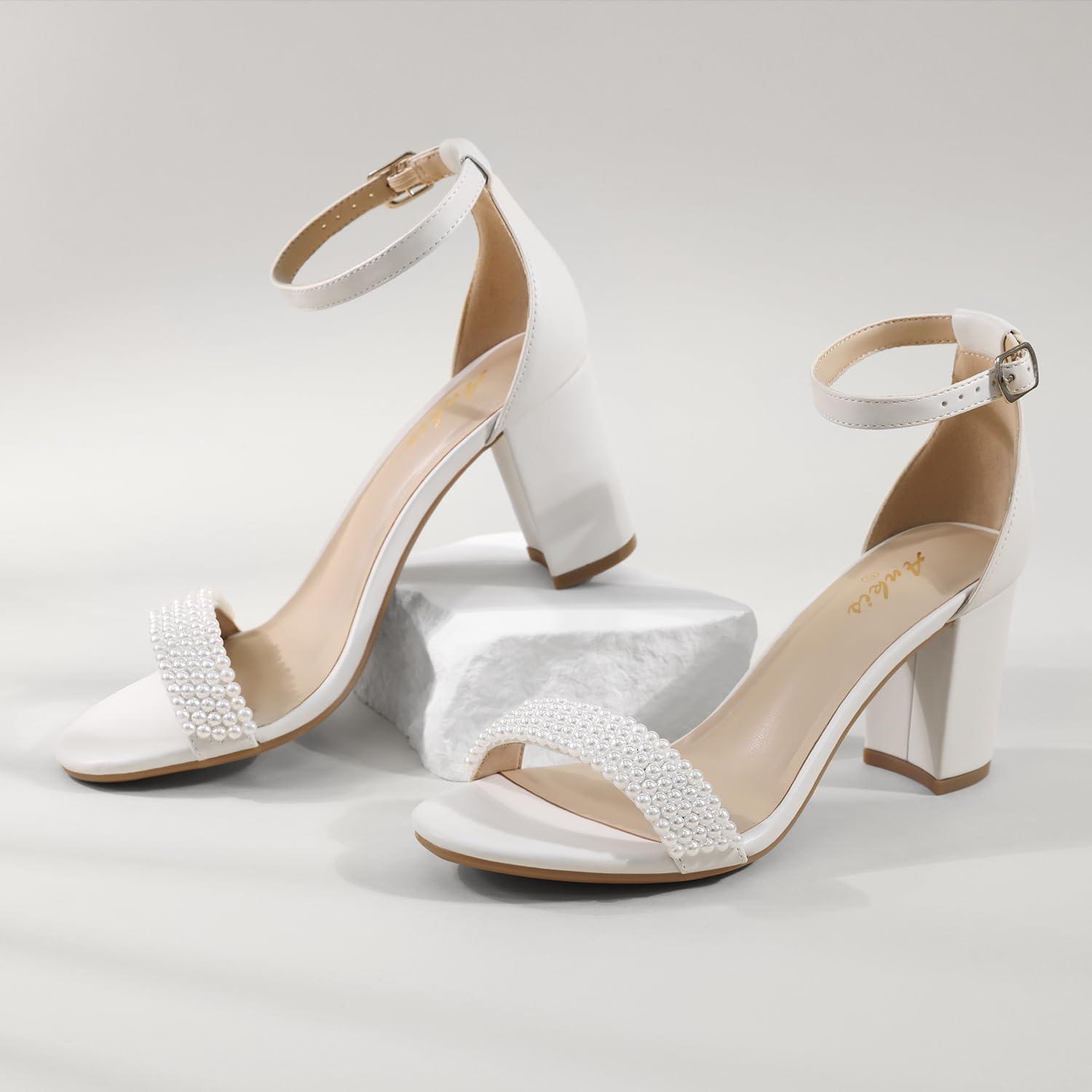 Ankis Heels for Women Open Toe Ankle Strap Chunky Heel Sandals 2.75 Inch(White Pearl)