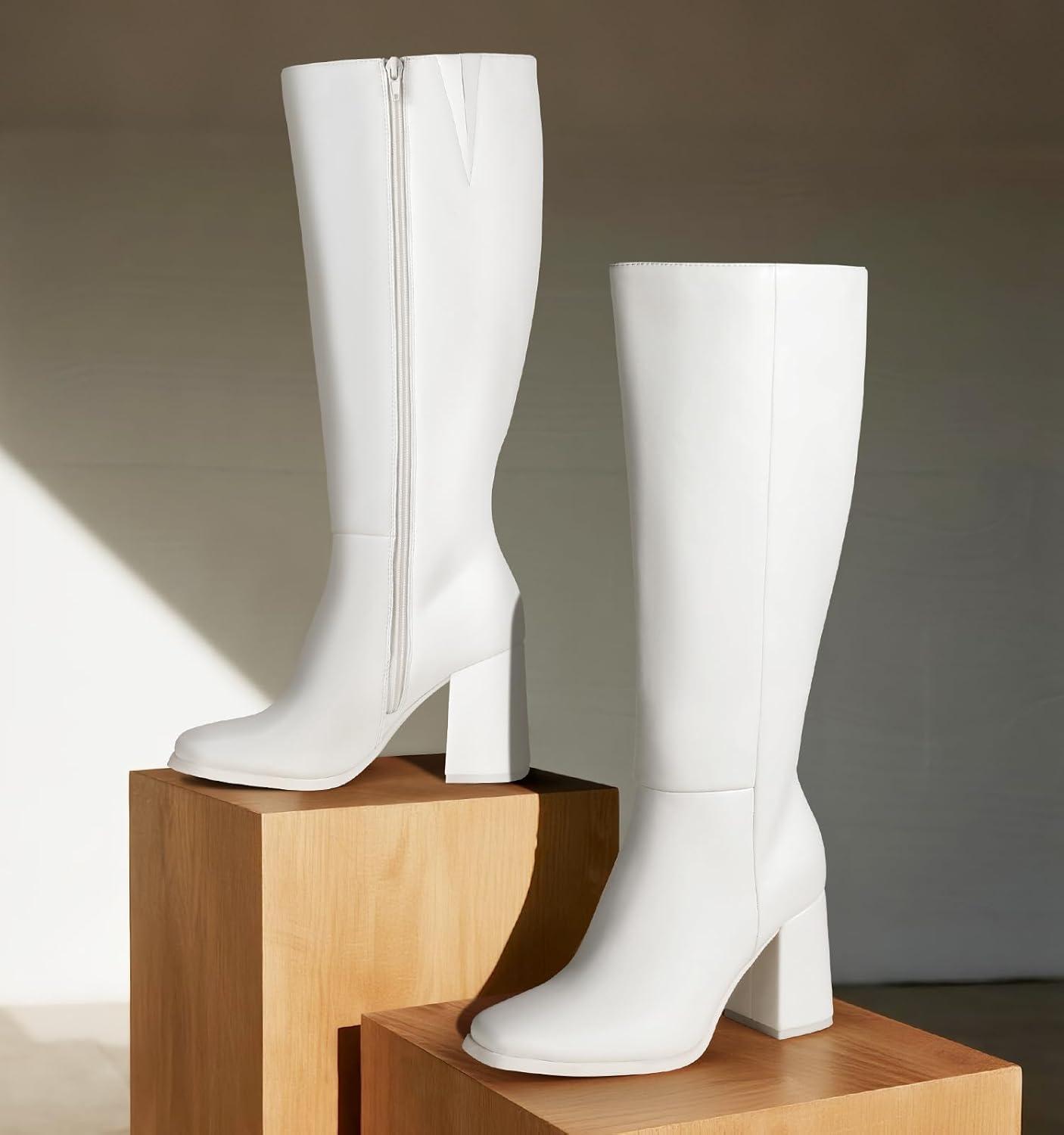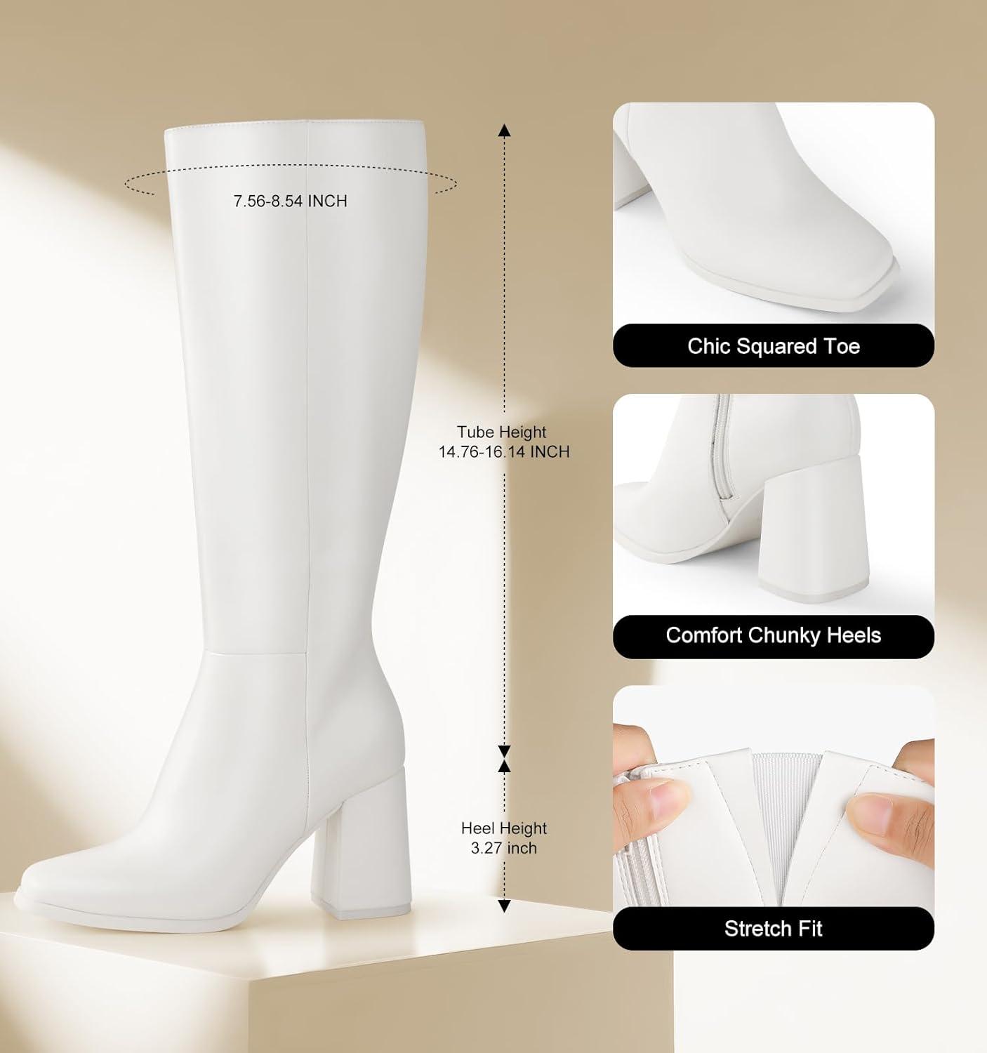 Ankis Knee High Boots for Women Squared Toe Chunky High Heel with Side Zipper Long Boots(White Pu)