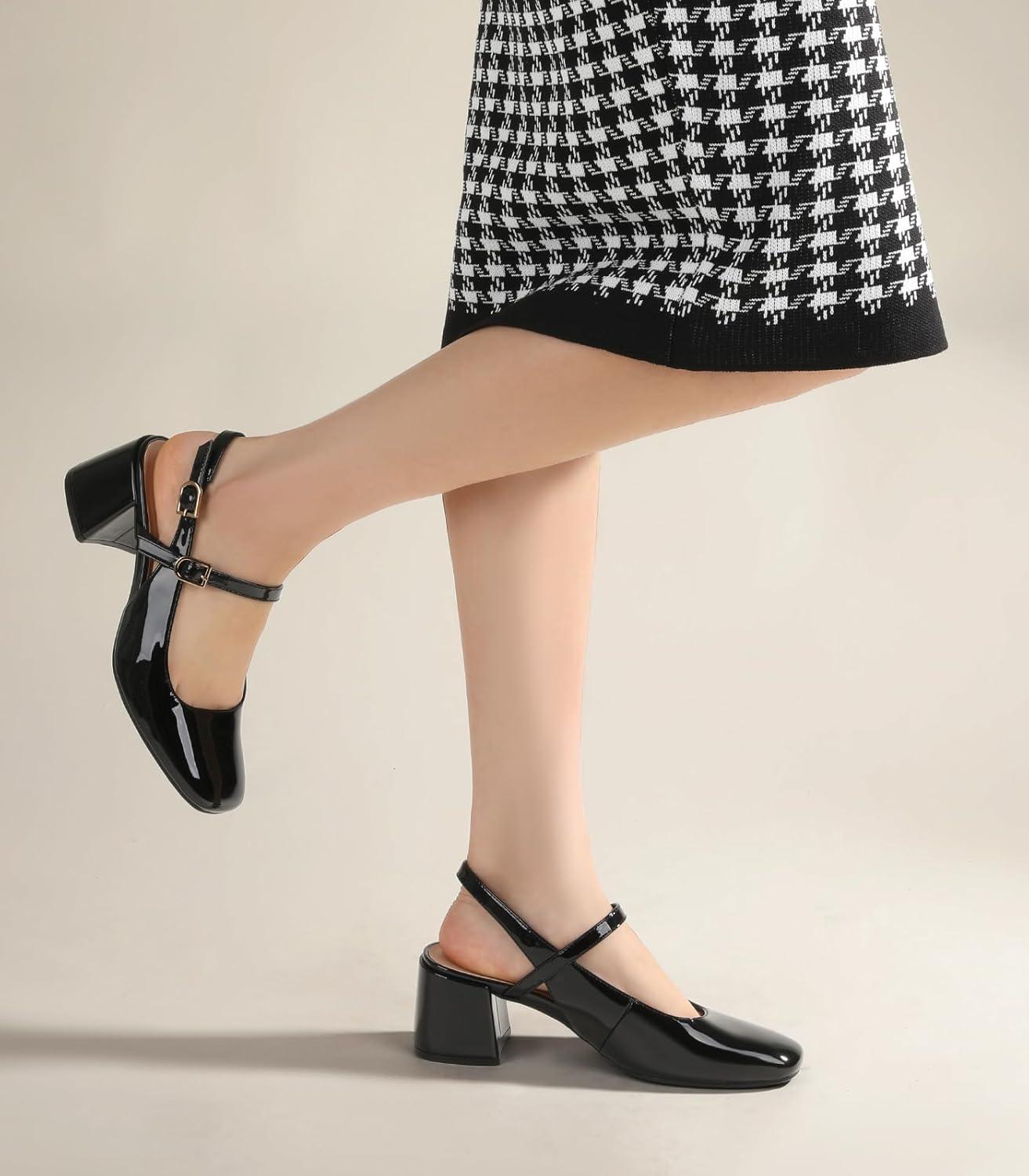 Ankis Mary Jane Chunky Low Heels Dress Shoes for Women Slingback Square Closed Toe Heels Wedding Party Pumps(Black Patent)