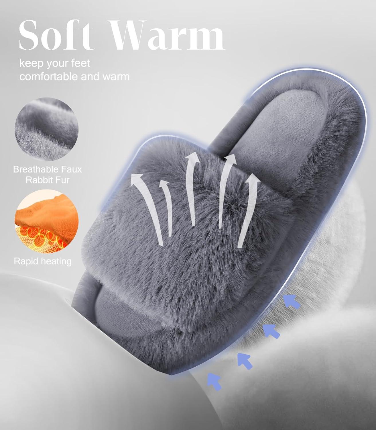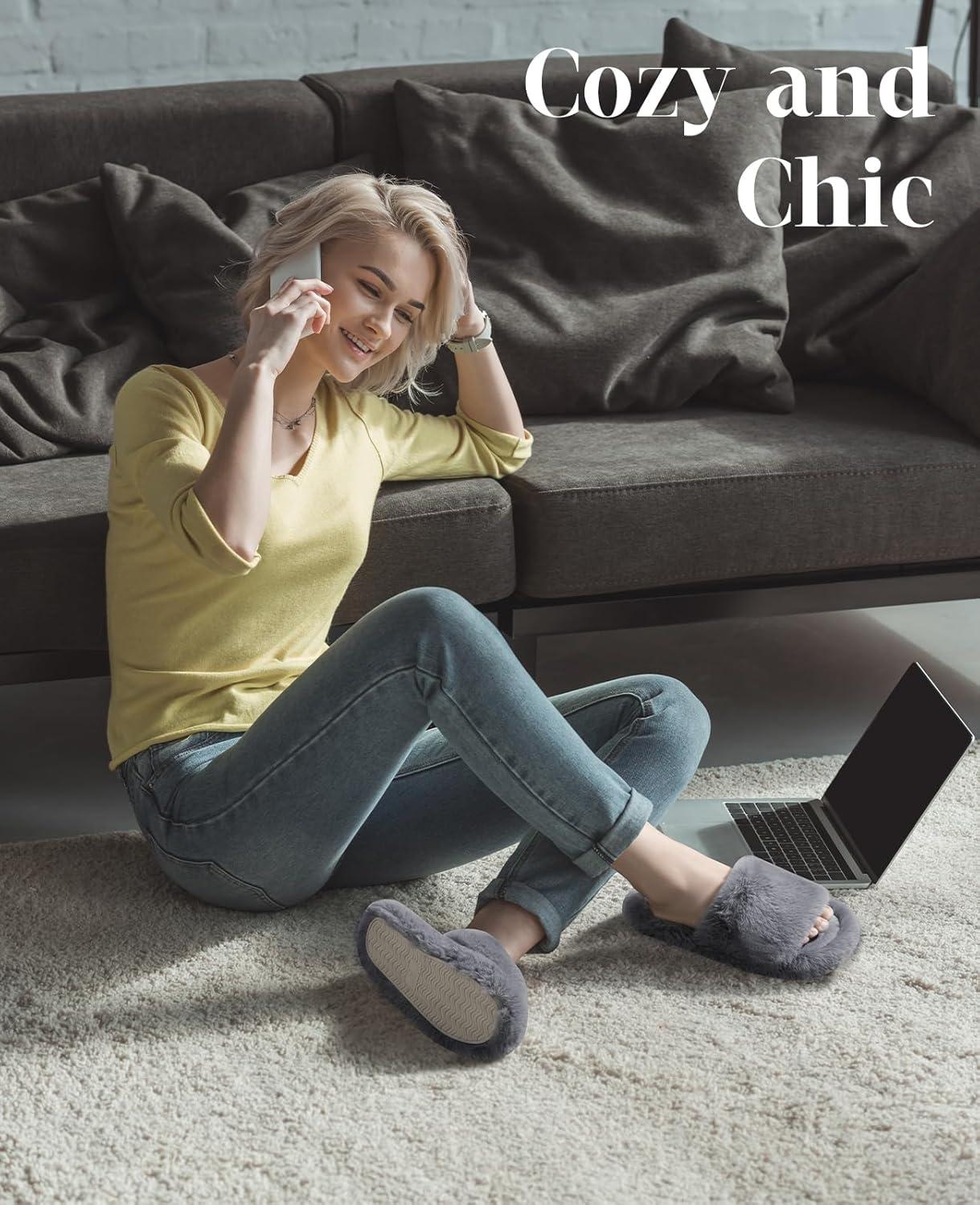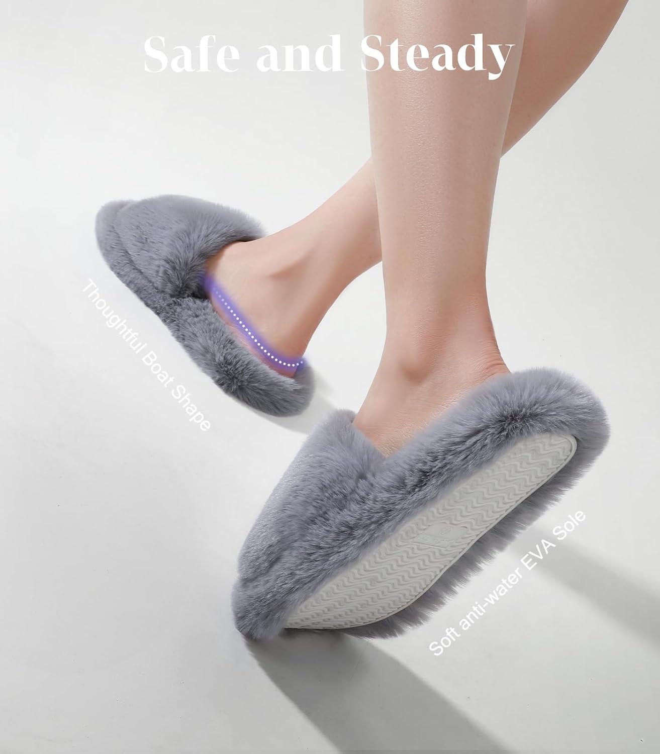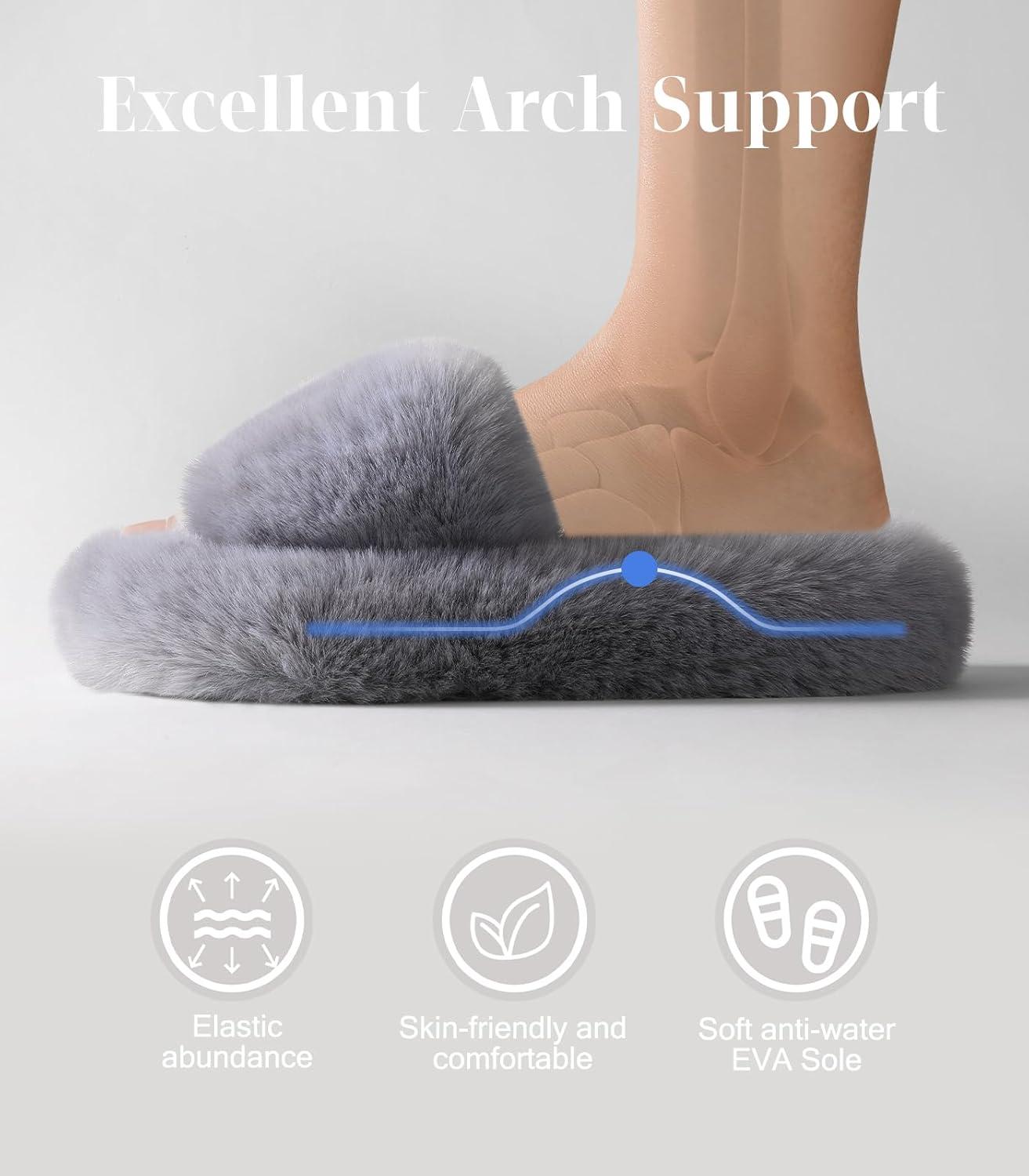 Ankis Womens’s Slippers Comfy Memory Foam House Open Toe Fuzzy Slipper Plush Indoor Outdoor Slide Furry Platform Fur Lined Shoes(Grey)
